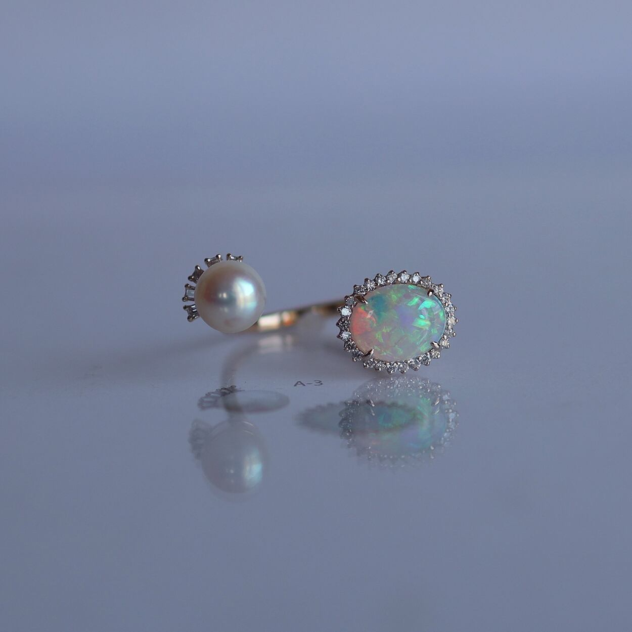 【価格には消費税が含まれています】 リモデル商品。 お持ち込みのジュエリーの石を使用いたしました。 [型 番] Re-Ta-3 [素 材] K10YG/ダイヤモンド・パール・オパール [サイズ] #16